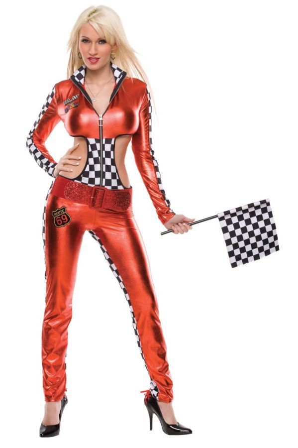 Костюм рискующей рейсерши включает в себя комбинезон красного цвета с вырезами по бокам и чёрно-белыми вставками. Флаг в комплект не входит. Такой костюм подойдёт для тематических вечеринок, для гонок и других мерпориятий. Имитация винила.