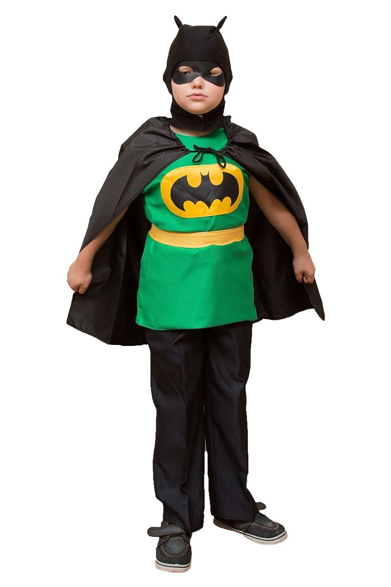 Детский костюм отважного Бэтмена подойдет для маленьких любителей комиксов. В костюм входит черная шапка, маска на глаза, зеленая яркая безрукавка с эмблемой Бэтмена на груди, желтый пояс, а также плащ-накидка на завязочках.