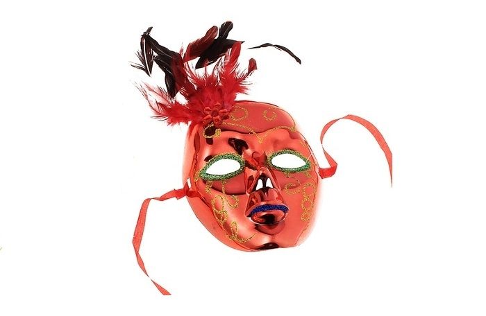 Маска в виде лица красного цвета с золотистым рисунком, украшенная перьями и маленьким цветочком, настоящая находка для любителей карнавальных вечеринок. Маска полностью скроет лицо и вы сможете сохранить тайну своего присутствия на вечере. Маска сделана из пластика и имеет размер 4х16х35 см.