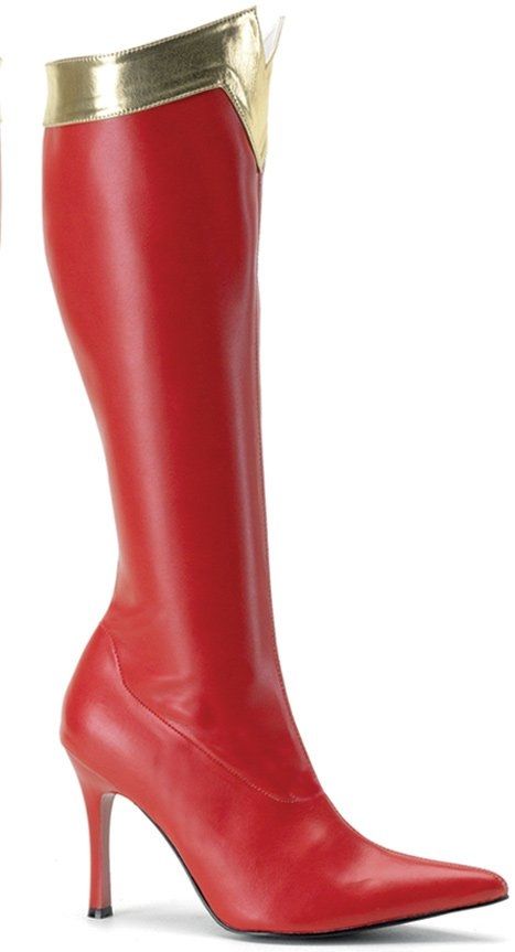 Сапоги суперменши, оформленные в классическом стиле ретро-супергероев, подойдут к костюмам суперменш и прочих сходных по тематике и цветовому оформлению. Высота каблука приблизительно 9 см.
