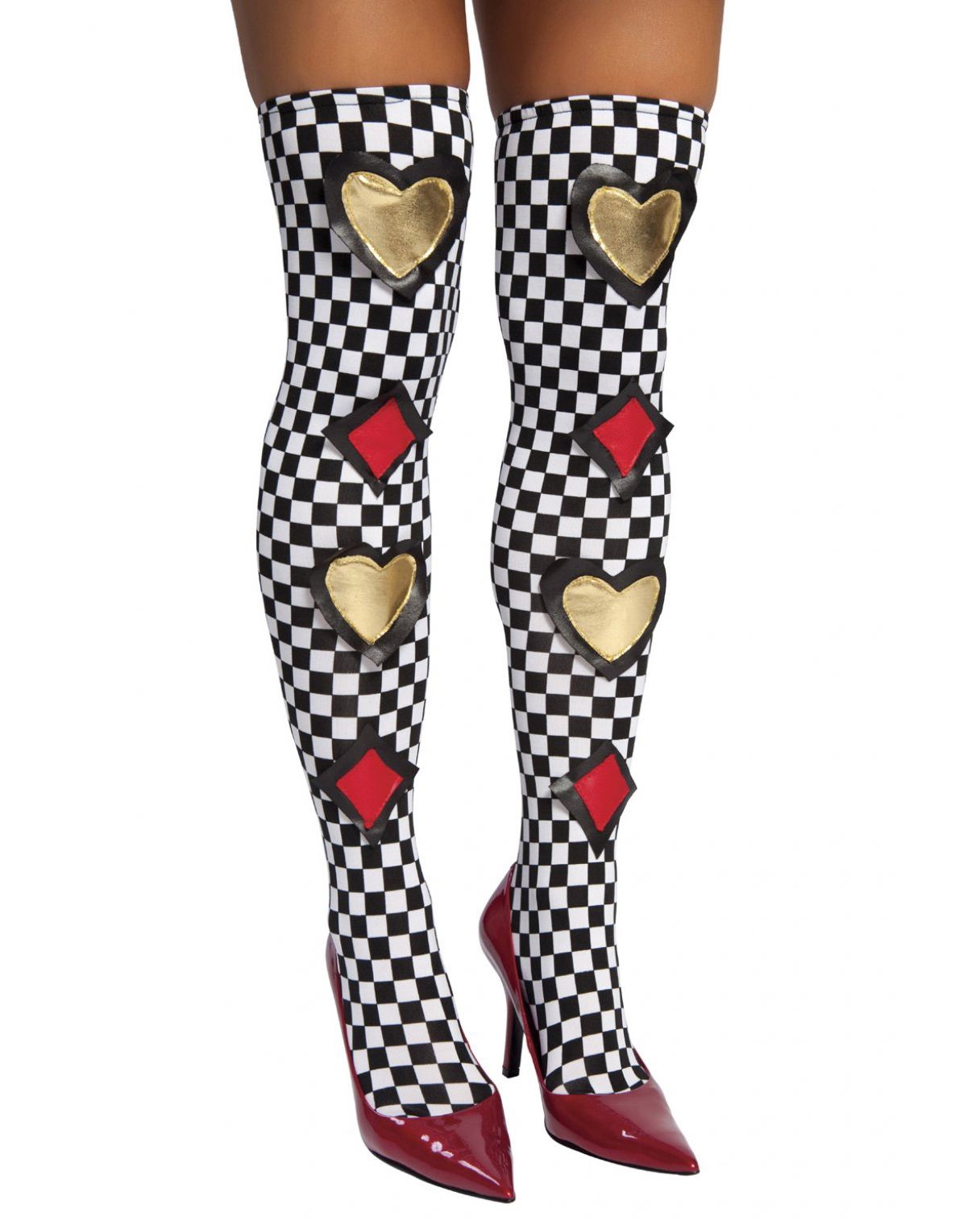 Чулки с сердечками и ромбами - это эластичные чулки выше колена, выполненные в черно-белый квадратик и украшенные спереди золотыми сердечками и красными ромбиками.