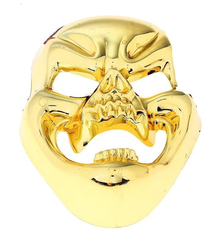 Золотистая маска смеющегося черепа сделана из пластика и имеет размер 18х25 см.