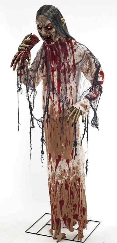 Манекен  голодного зомби с рукой сможет напугать каждого. Такой манекен может стать незаменимой вещью на Хэллоуин. На вечеринке это будет один из самых мерзких костюмов.