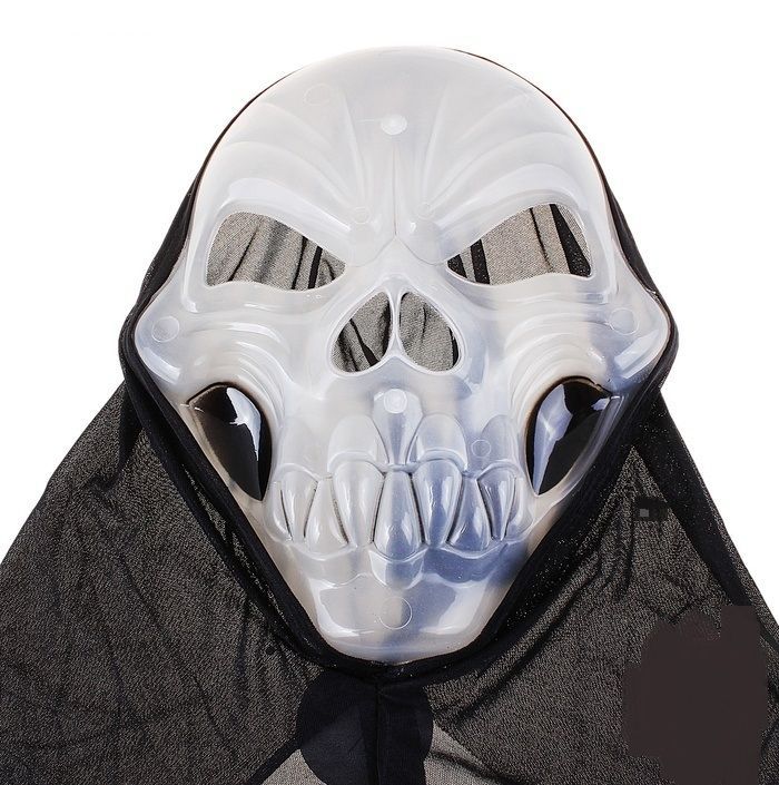Светоотражающая маска черепа в накидке черного цвета с большими глазницами и жуткими зубами. Особый эффект маска производит в темноте. Маска сделана из пластика, накидка из ткани. Размер маски 5х20х25 см.