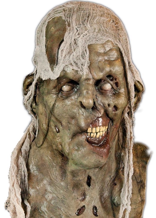 Маска перекосившегося зомби выполнена из латекса болотного цвета. Перекосившийся рот, закатившиеся глаза, марля на голове - жуткое и неприятное зрелище, но оно прекрасно подойдёт для Хэллоуина и Пятницы 13.