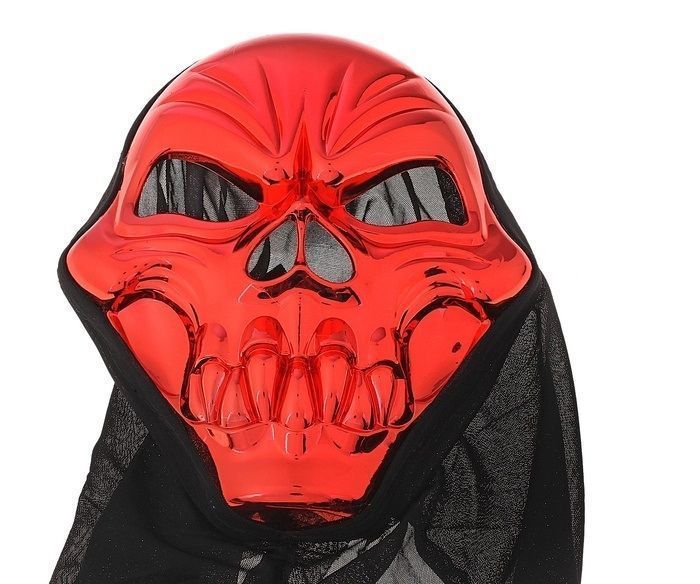 Красная маска черепа в накидке черного цвета с большими глазницами и жуткими зубами. Маска сделана из пластика, накидка из ткани. Размер маски 5х20х25 см.