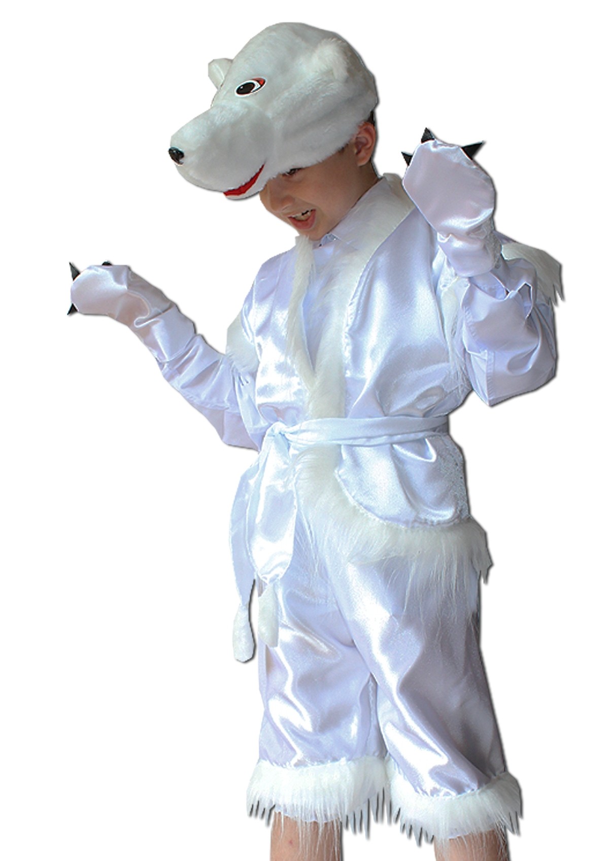 Детский костюм белого медвежонка - атласный костюм белого цвета, в комплект которого входит меховая шапочка-маска в виде мордочки медведя, белые бриджи с меховой отделкой, жилет с поясом, а также перчатки в виде лапок медведя с коготками.