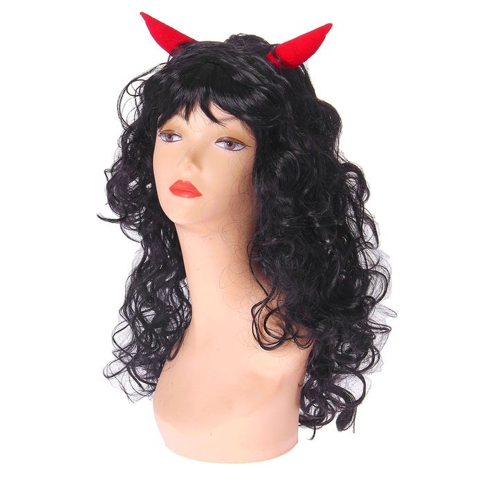 Черный парик дьяволицы - это длинный парик из черных вьющихся искусственных волос с небольшой челкой, украшенный яркими красными рогами. Парик дополнит костюмы дьяволиц и подобных персонажей, а также станет отличным сувениром на Хэллоуин.