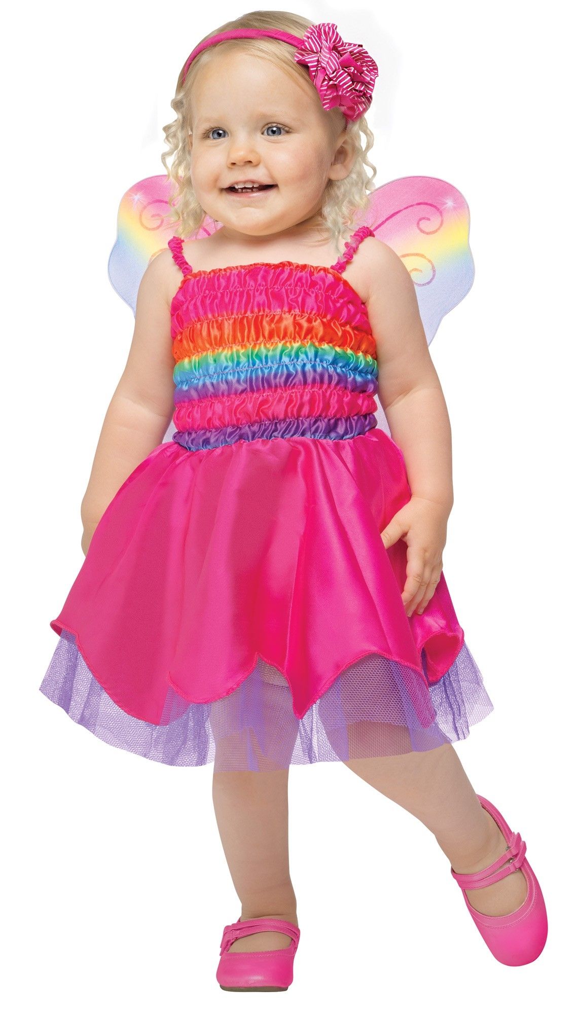 Костюм малышки Радужной бабочки - яркий разноцветный костюм для маленьких девочек. В комплект входит розовое платье с разноцветным топом в сборочку, а также легкие разноцветные крылышки.