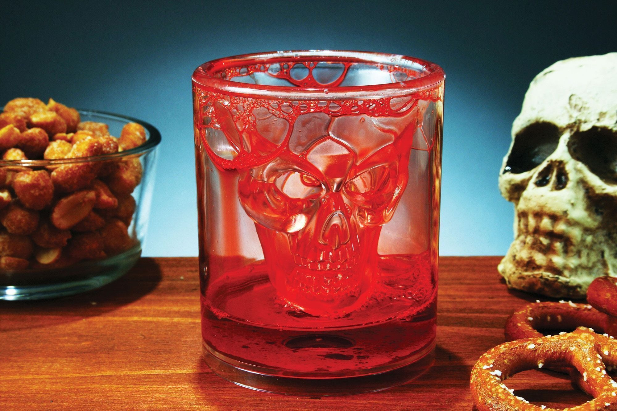 Стакан Кровавый череп - это идеальный сосуд для напитков на Хэллоуин, Пятницу 13 и подобные праздники. Стакан выполнен из прозрачного стекла, в стакане имеется литой прозрачный череп, в который и наливается жидкость. Искусственная кровь заполняет пространство за черепом.