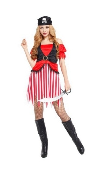 Костюм милой морской разбойницы - стильный вариант наряда на Хэллоуин и другие тематические вечеринки. Костюм включает в себя красно-белое платье с рваным подолом, черную короткую жилетку и бандану на голову.