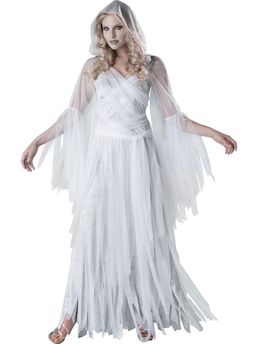 Если вы собираетесь на Хэллоуин, предлагаем вам выбрать костюм прекрасного призрака - длинное белое платье с рукавами и капюшоном и поясом (Грим в комплект не входит). Загадочный силуэт, который словно тень весь вечер ходит за гостями и пугает своим безмолвным присутствием. В костюме прекрасного призрака вы станете королевой загробного мира.
