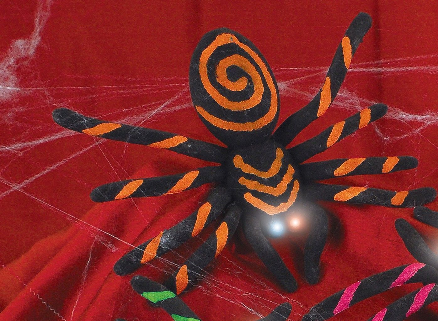 Тарантул со светящимися глазами оранжевый идеально украсит помещение на Хэллоуин и подобные праздники. Паук выполнен в черном цвете с яркими оранжевыми узорами на тельце и лапках. У тарантула светящиеся глаза. Его размер, примерно 20 см.