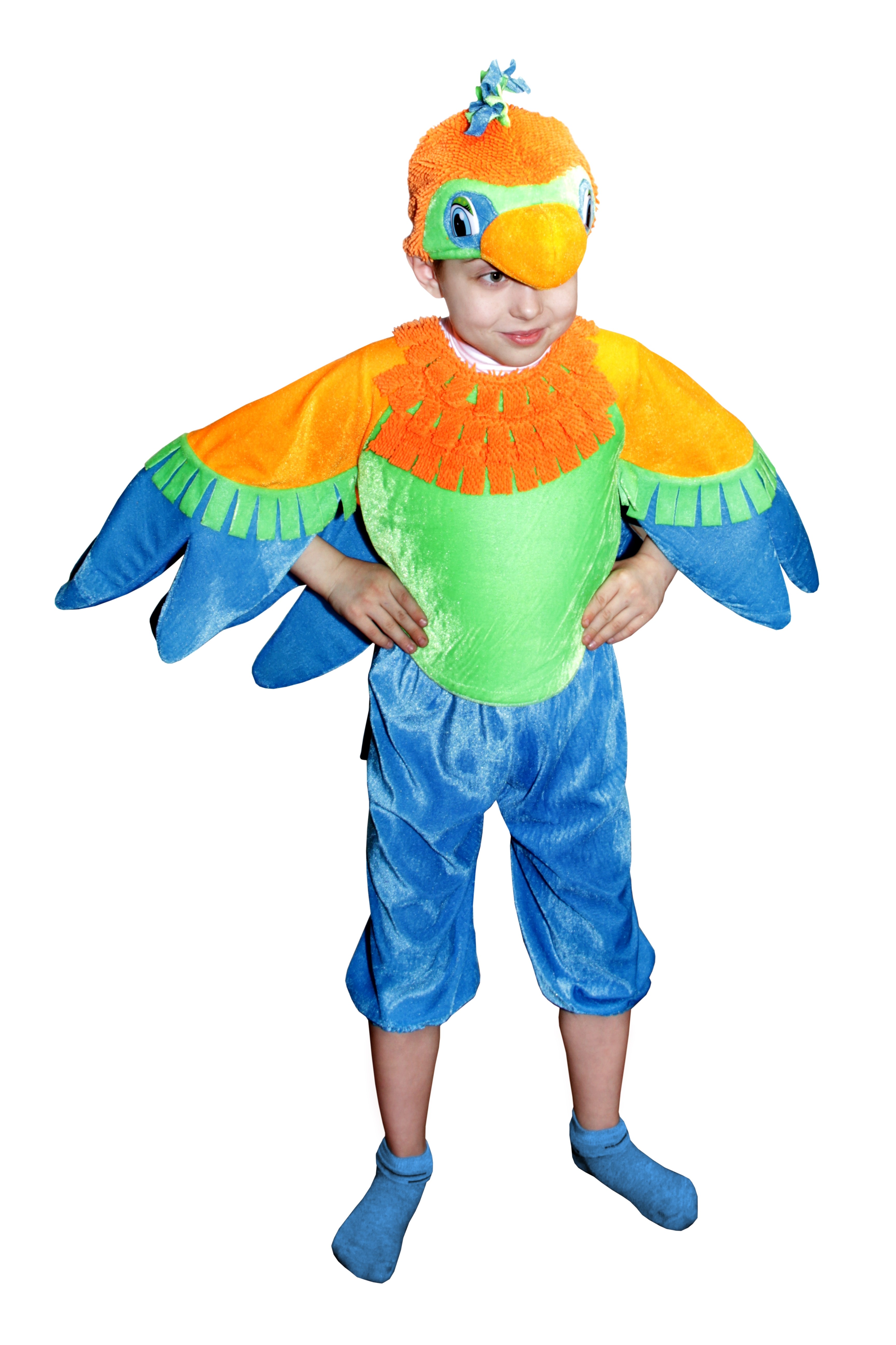 Костюм яркого попугая выполнен из мягкого плюшевого материала и включает в себя бриджи на резиночках, яркую разноцветную кофту с крыльями, а также шапочку-маску, выполненную в виде мордочки попугая с желтым клювом.