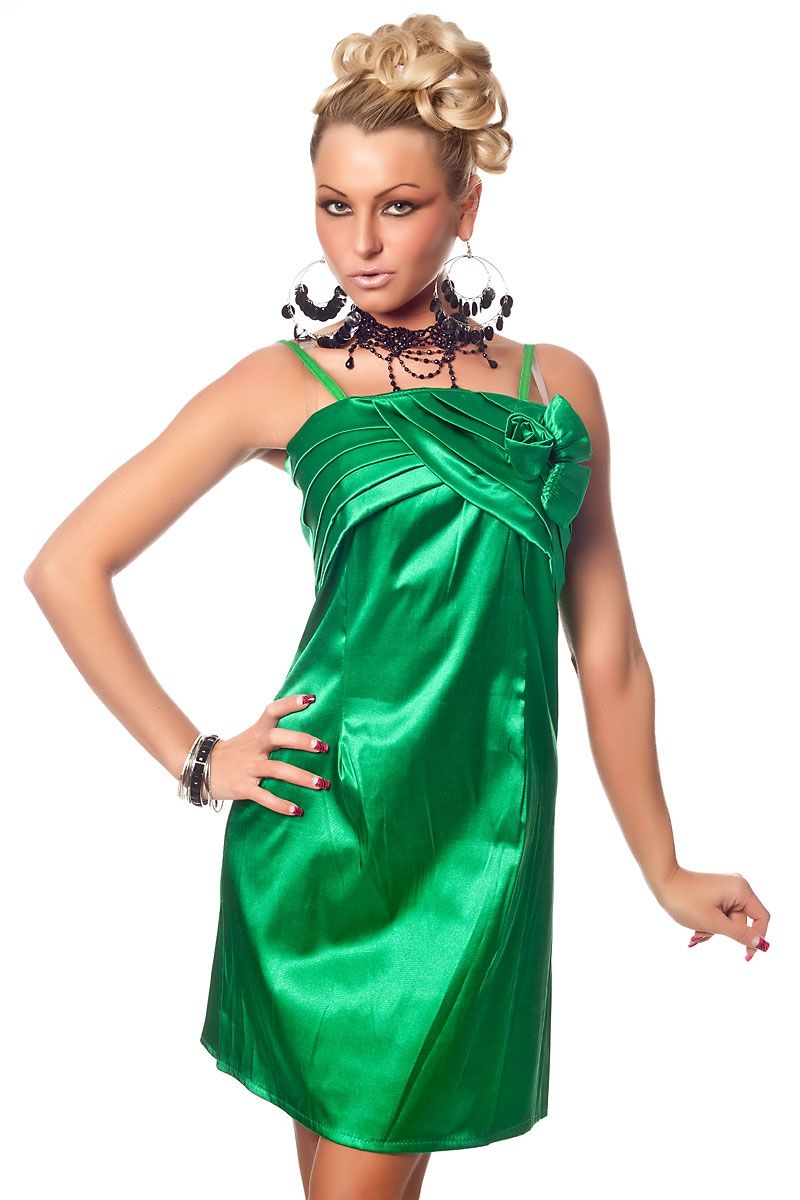 Зеленое платье с розочками - это прекрасное атласное платье, выполненное в сочном зеленом цвете. Платье на тонких бретельках. Сзади на спине есть скрытая молния. На юбке снизу на задней части имеется разрез. Это прямое платье со свободной юбкой. Лиф украшен переплетенными полосочками, а также тремя розочками.