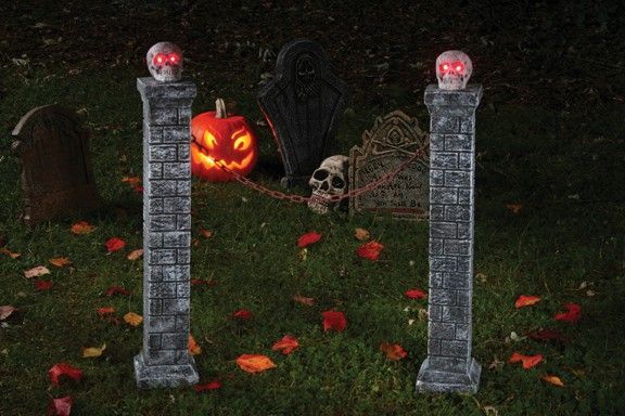 Зловещий портал 70 см - прекрасная декорация для входа в дом. Высота столбов составляет 74 см, на каждом из них имеется череп со светящимися глазами, которые загораются при прикосновении. Два столба выполнены в сером цвете, они соединены цепью.