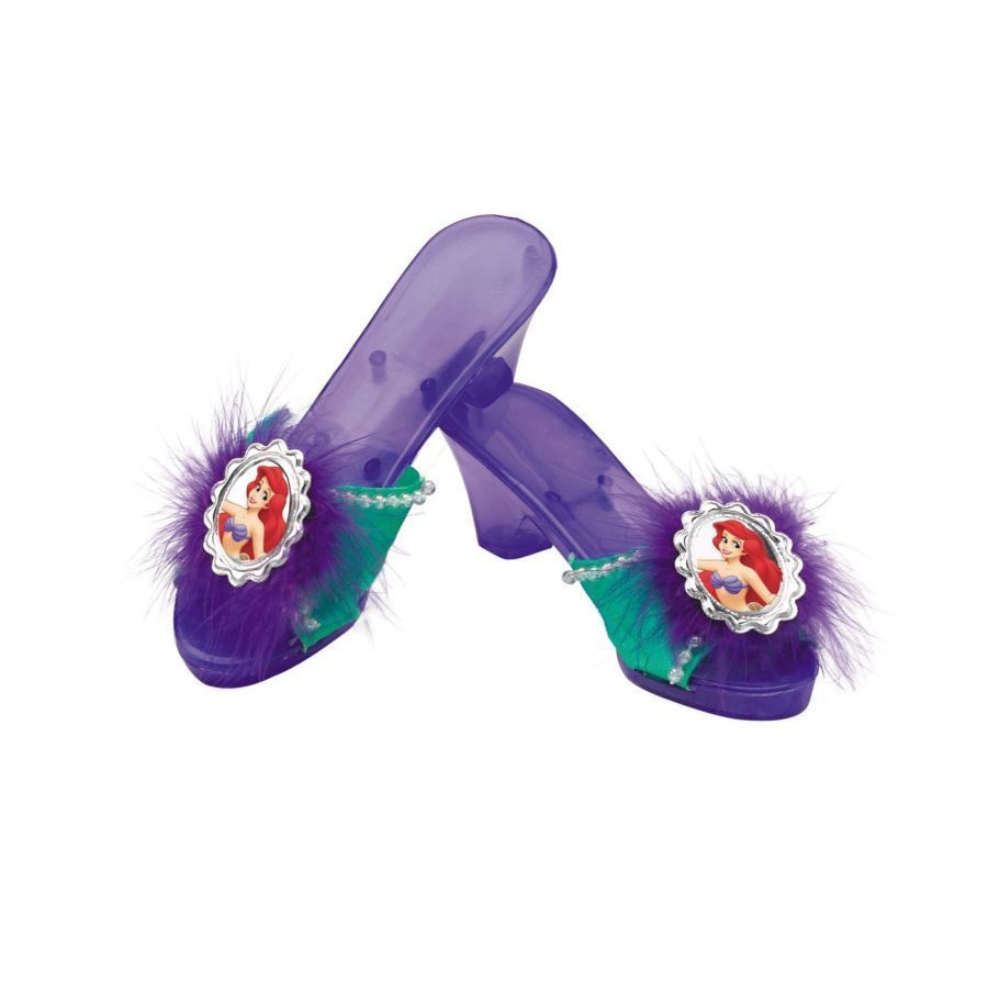 Детские туфли Ариэль выполнены из плотно пластика фиолетового цвета. Туфельки украшены марабу, бисером и изображением русалочки Ариэль. Такие туфли прекрасно дополнят платья принцесс и подобные образы. Размер стельки 20 см.