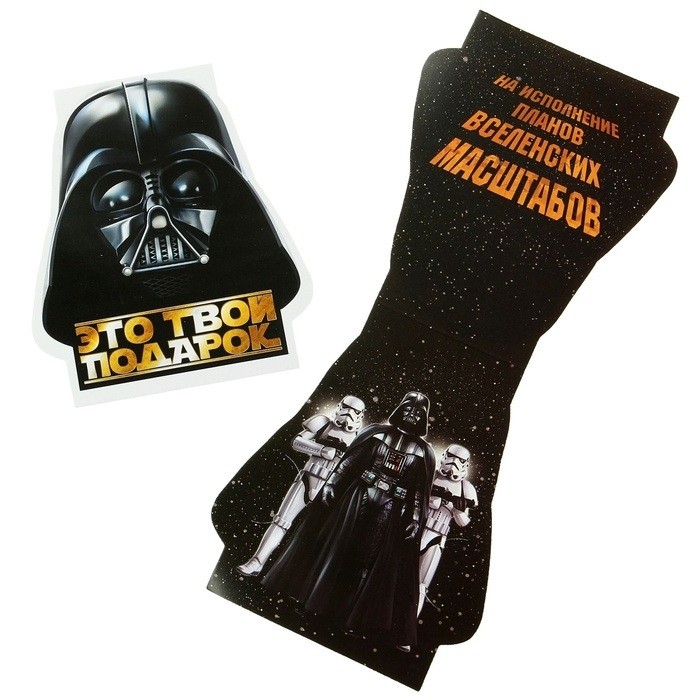 Открытка-конверт Звездные войны - черная открытка для денег, выполненная в форме шлема Дарт Вейдера прекрасно подойдет для поздравления любителей саги Star Wars.