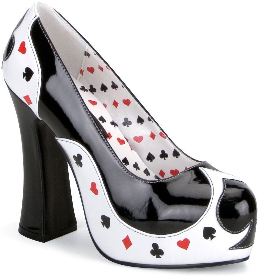 Туфли покер, черно-белого цвета, декорированные карточными мастями, подойдут для костюмов с подобным цветовым оформлением. Высота каблука приблизительно 12 см.Рекомендации по уходу: Только чистка по месту загрязнения.