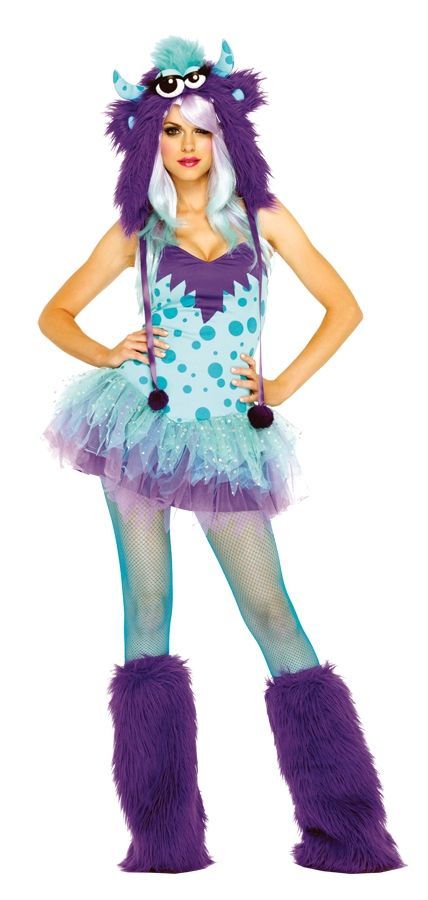 Костюм монстрика Дотти выполнен в фиолетовых и голубых тонах. В комплекте имеется яркое платье с пачкой и пушистым капюшоном с рожицей и рожками. Пушистые гетры в комплект не входят, но их можно приобрести отдельно, а также другие дополнительные вещи.