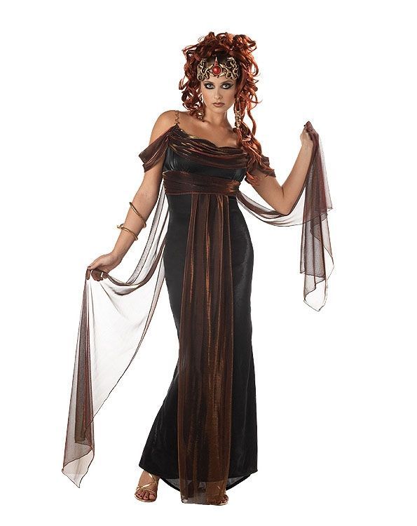 Костюм мифической медузы выполнен в чёрно-коричневых цветах. В комплекте костюма имеется элегантное длинное платье с пелериной, изящный головной убор. Такой прекрасный костюм подойдёт для тематических вечеринок, выступлений и прочих мероприятий.