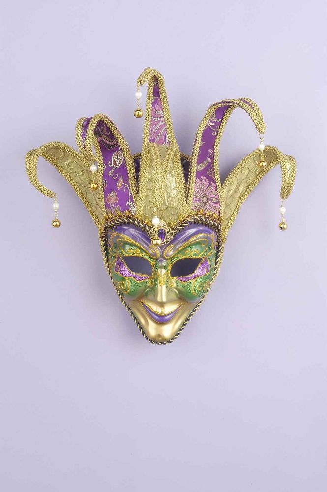 Фиолетово-золотая венецианская маска это маска на все лицо с улыбкой. Маска выполнена в золотом цвете с черно-золотой тесьмой. Вокруг глаз она украшена фиолетово-зелеными узорами. Сверху к маске прикреплен головной убор с бубенчиками, выполненный в золотом и фиолетовом цветах.