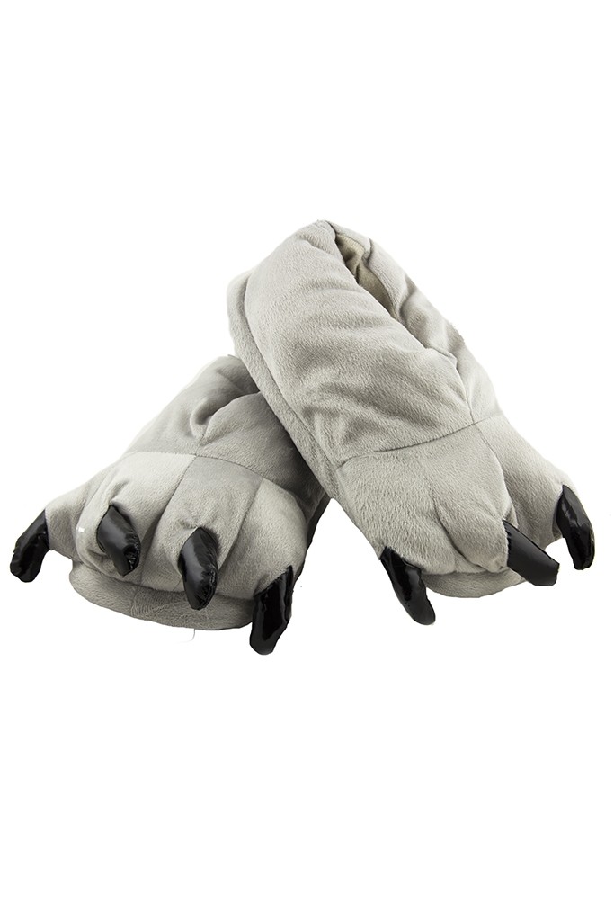 Серые мягкие лапы - отличное дополнение к домашней пижаме-кигуруми. Лапы-тапки выполнены из мягкого материала серого цвета и дополнены черными мягкими когтями.
