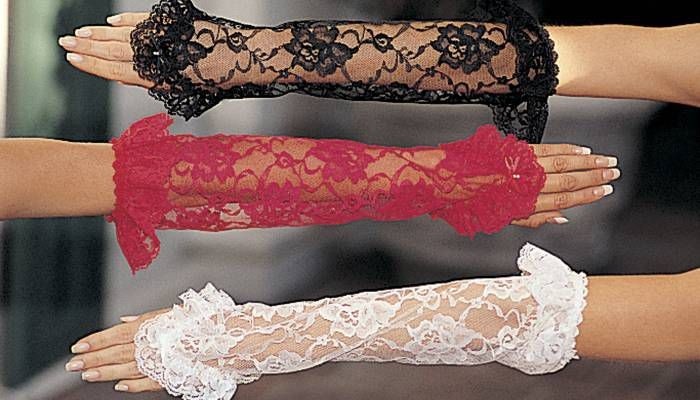 Красные ажурные перчатки смогут идеально дополнить элегантные наряды. Перчатки без пальцев выполнены из кружевного материала с цветочными узорами. Верхняя часть перчаток дополнена кружевом.
