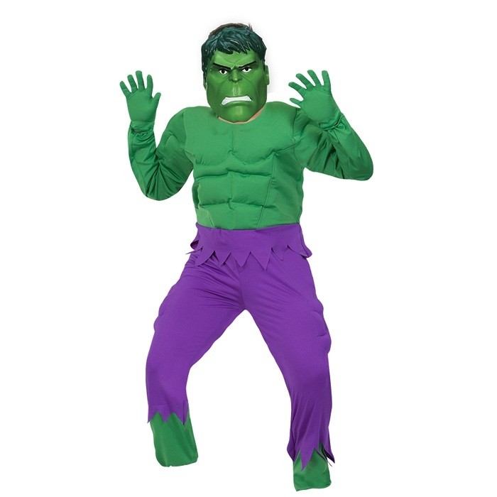 Костюм Халка для детей - яркий костюм, который представляет собой образ грозного Халка из одноименного фильма. В комплект костюма входит яркий комбинезон с зеленым торсом и фиолетовыми брюками с оборванными краями. Комбинезон с накладными мышцами. Также в комплект входит маска.
