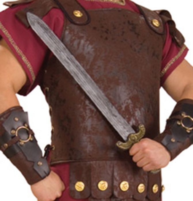 Длинный римский меч выполнен из пластика. Меч серого цвета с золотистой рукояткой.