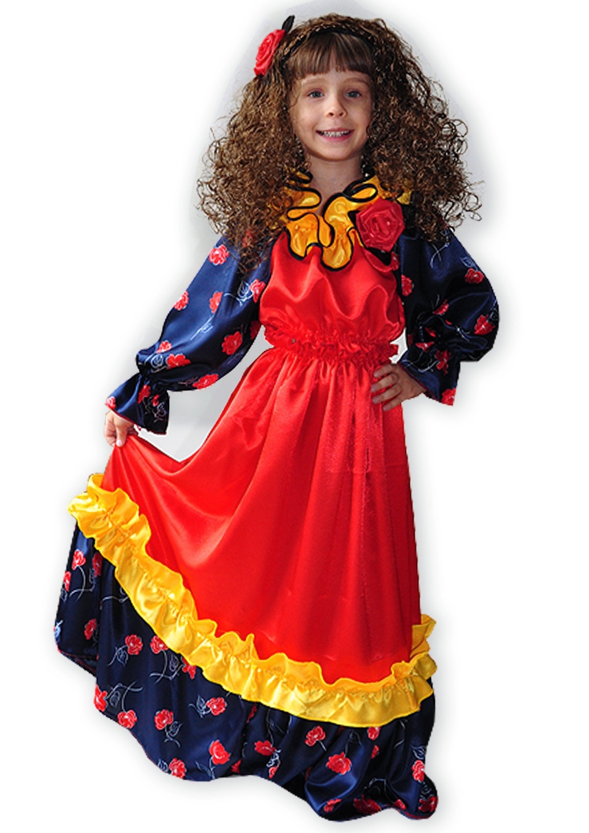 Детский атласный костюм Цыганки включает в себя темно-синюю кофту с длинными рукавами, красный топ, украшенный розой, а также длинную широкую юбку красного цвета с синим подолом и красную розу в качестве украшения для волос.