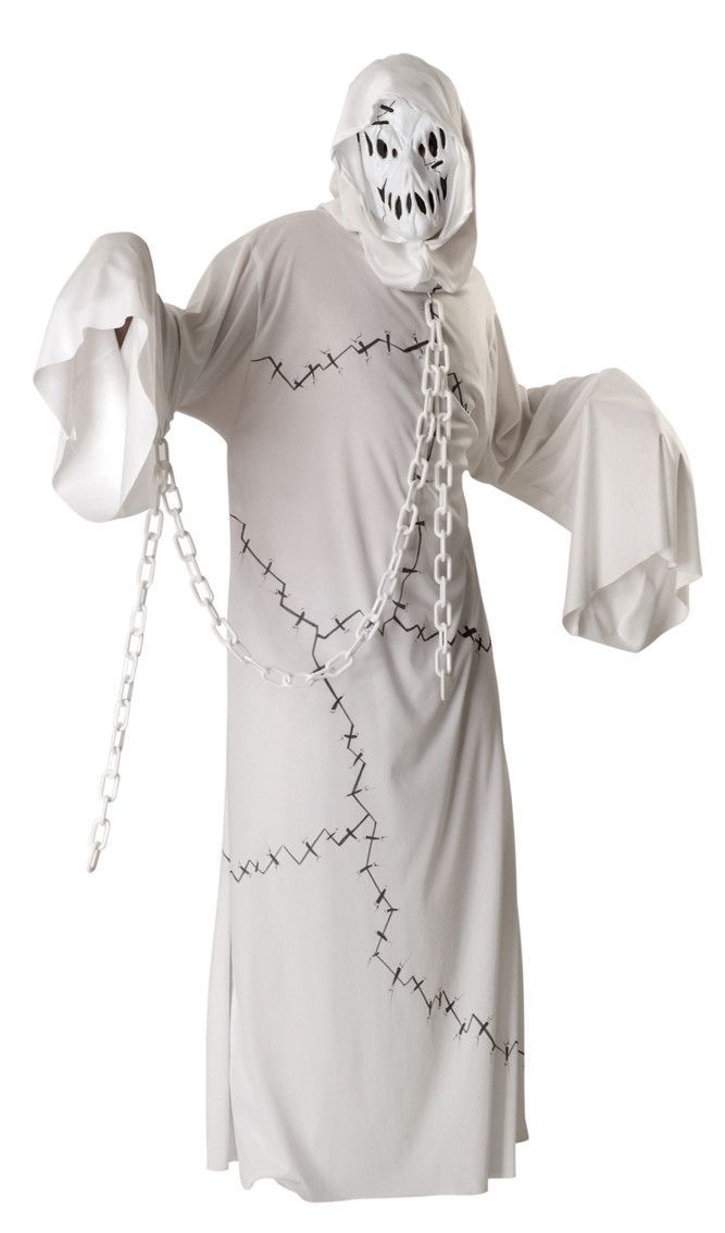 В костюм злобного привидения входит: ряса с капюшоном, маска и цепи.