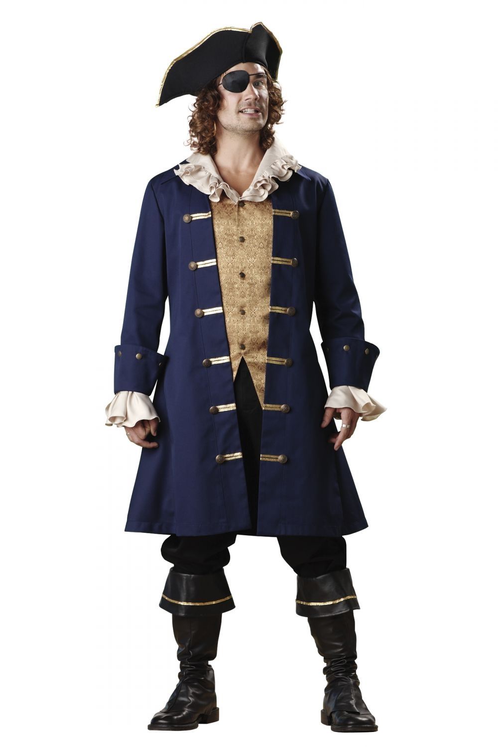 В костюм капитана входит: рубашка со вшитым жилетом (100% полиэстер), пальто (65% полиэстер, 35% хлопок), голенища, повязка на глаз, серьга.