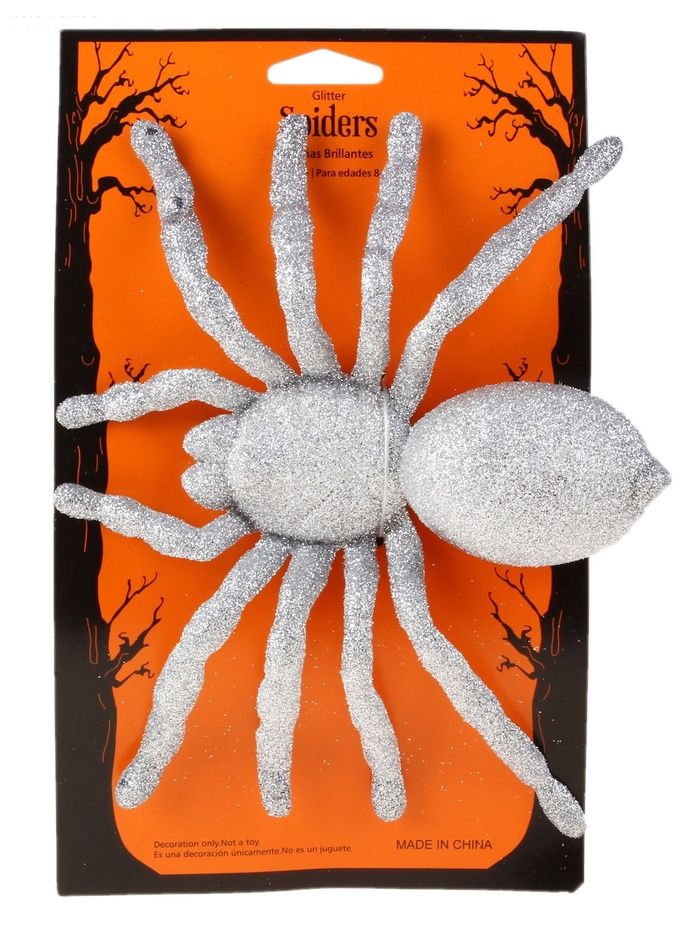 Серебряный паук станет хорошим аксессуаром для вечеринки в честь Хэллоуина. Паук выполнен в серебряном цвете и украшен блестками.