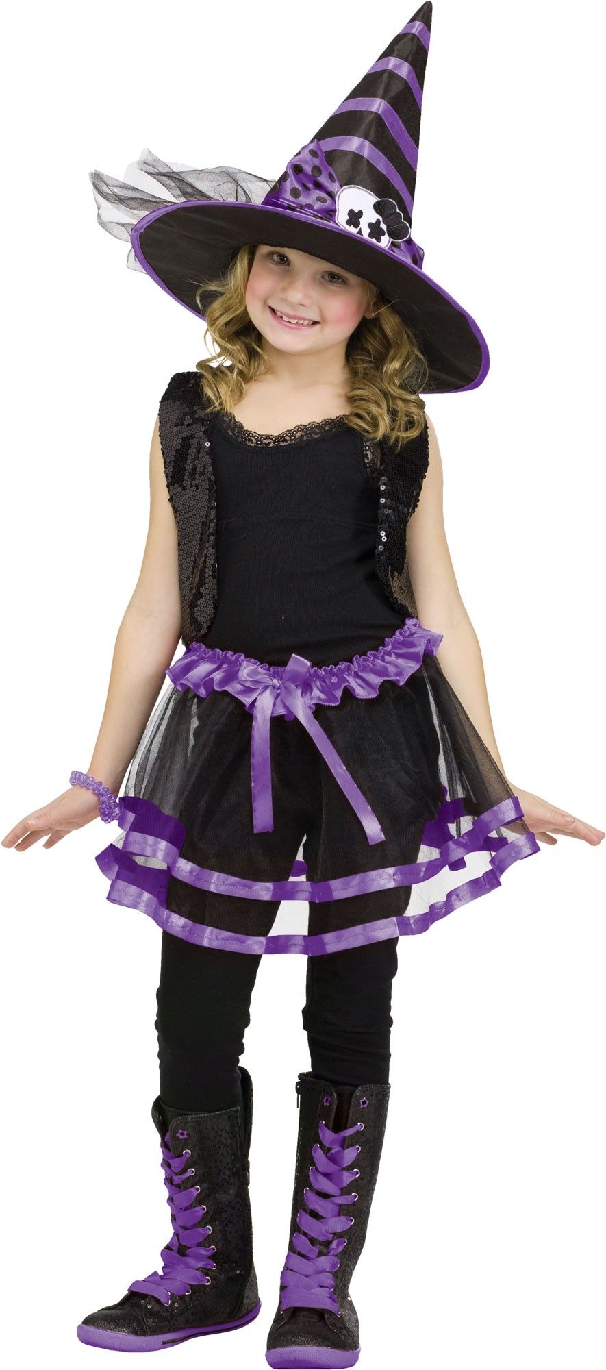 Юбочка Туту и шляпа с фиолетовой лентой - это набор, который поможет вам создать идеальной костюм ведьмочки. В набор входит черная юбочка из двух слоев сетчатого материала с фиолетовой каймой, а также черная шляпа с фиолетовыми полосками и бантиком.