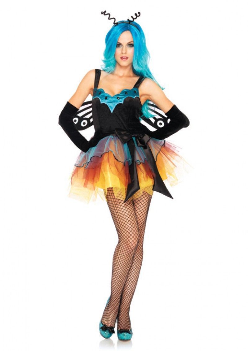 Костюм Бабочки Феи - это яркое короткое платье с оранжевой многослойной юбкой и черным бантом. К платью прилагаются черные рожки-антенки в виде спирали. Крылья в комплект не входят.