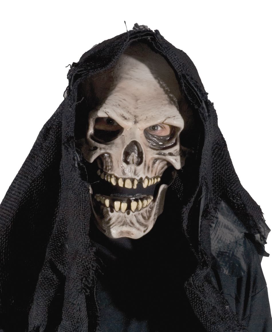 Маска ликующей Смерти с капюшоном прекрасно дополнит костюмы Смертей. Маска выполнена из латекса, капюшон из мешковины чёрного цвета. Такая маска подойдёт для таких праздников, как Хэллоуин, Пятница 13.