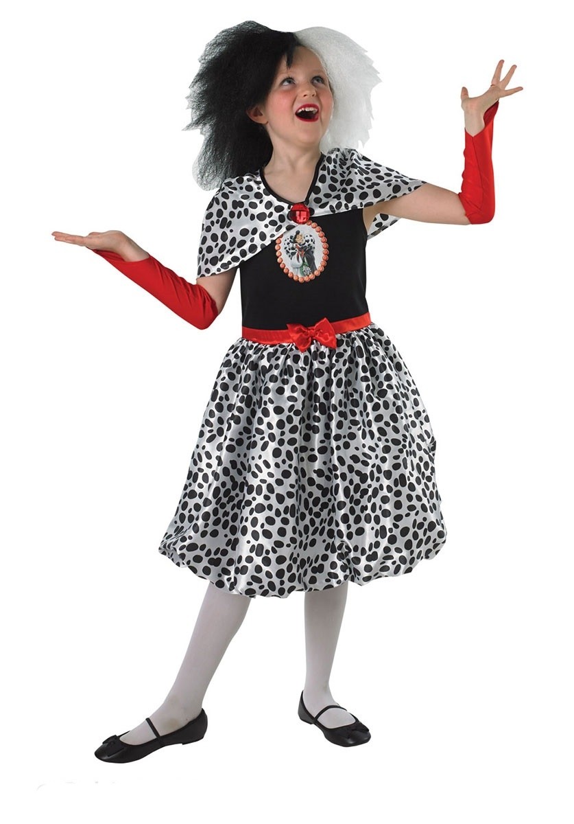 Костюм Круэллы Де Виль детский - костюм одного из главных персонажей-злодеев мультфильма "101 Далматинец". Костюм состоит из платья с пышной пятнистой юбкой, черным топом и пятнистой накидкой. Платье дополняет красный пояс с бантиком.