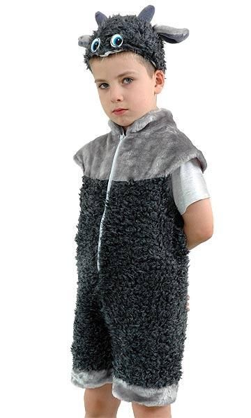 Серенький костюм с темными кудряшками на комбинезоне. Комбинезон на молнии. Шапочка с обвисшими бараньими ушками и рожками торчком в разные стороны тоже покрыта густыми бараньими кудряшками. Превосходный персонаж для детской сказки, карнавала или игры.