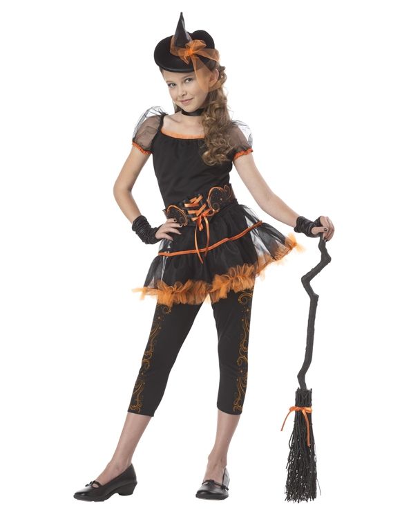 Детский костюм звездной ведьмочки выполнен в черном цвете с оранжевыми вставками. В комплект костюма входит платье с прикрепленным корсетом и рукавами фонариками, короткие перчатки без пальцев, мини-шляпка, а также черные леггинсы с узорами. Для дополнения озорного образа можно приобрести парик, метелку и другие аксессуары.