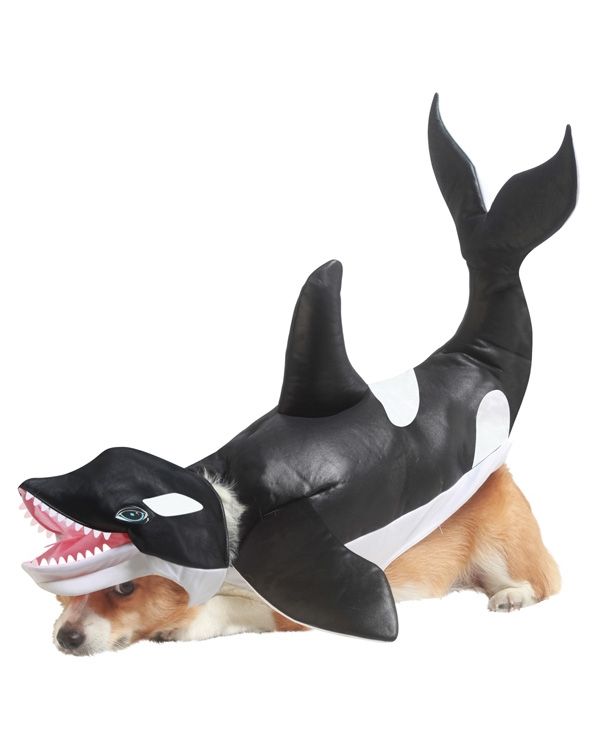 Костюм для собаки Касатка - это милый костюм для вашего питомца, выполненный в черно-белом цвете. В комплект костюма входит головной убор с глазками и зубками, а также боди с плавниками и хвостом, которое надевается сверху на спину собачке.