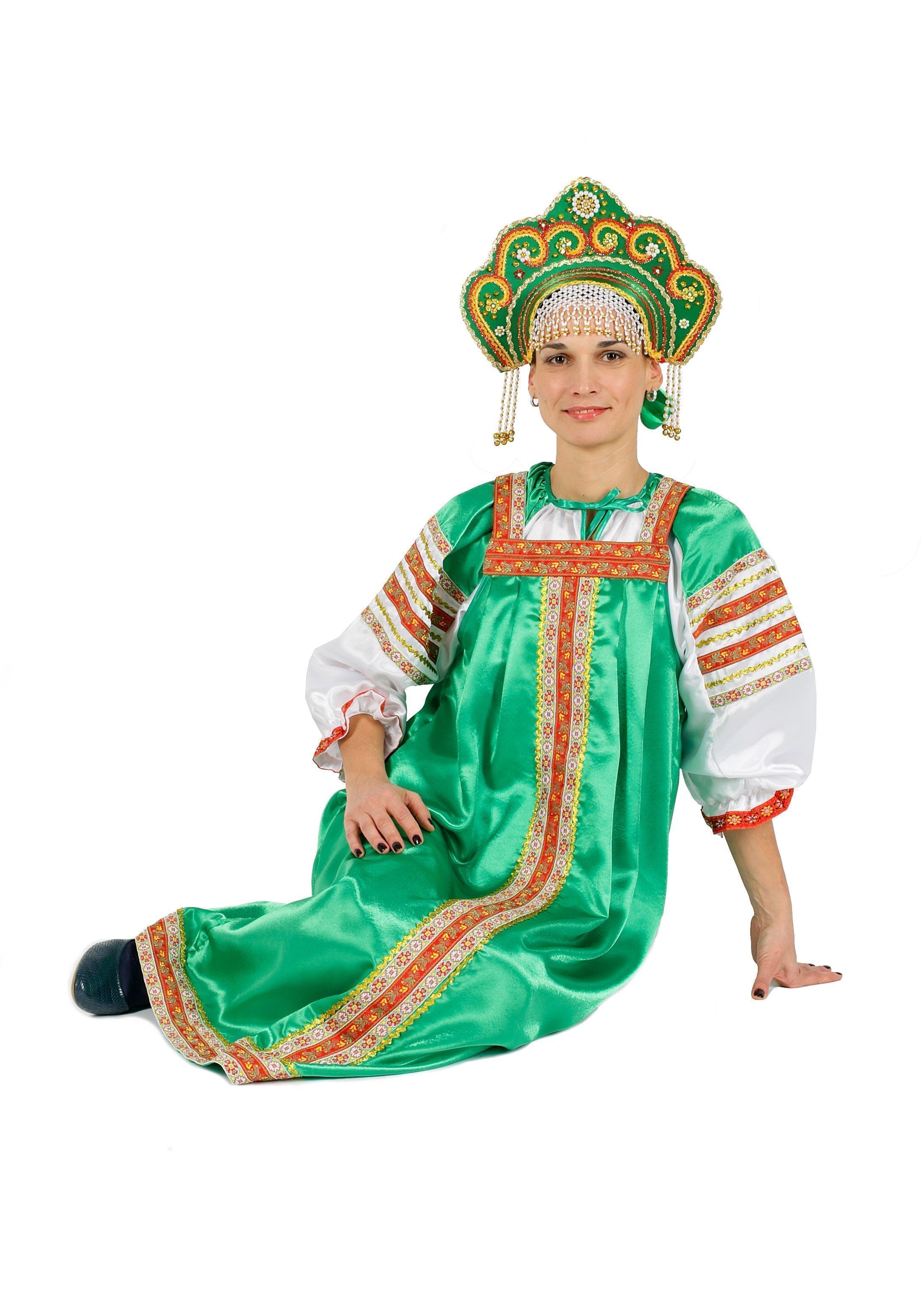 Костюм Варвара зеленый - это атласный длинный сарафан, выполненный в русском народном стиле. Сарафан украшает декоративная тесьма с узорами. Сарафан на широких бретельках.