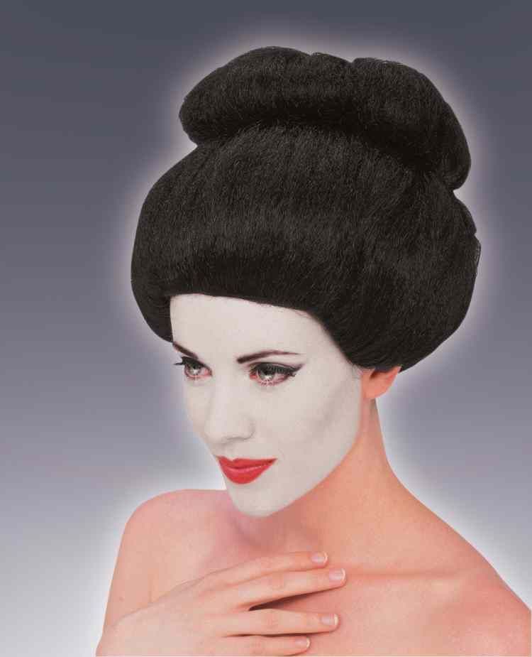 Чёрный парик гейши идеально подойдёт для маскарадов и карнавалов. Для полного образа гейши вы можете подобрать соответствующий грим и кимоно. В наряде китайской девушки и в таком парике вы станете похожи на настоящую изящную гейшу.