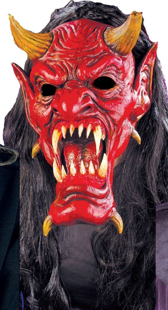 Маска красного демона выполнена в красном цвете. Оранжевые рога, жёлтые большие клыки, большие уши и длинные чёрные волосы - прекрасное сочетание для маски демона. В ней вы сможете напугать практически каждого.