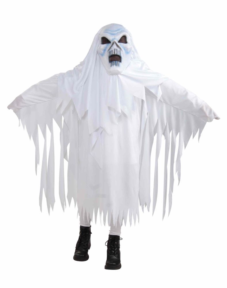 Жуткий костюм привидения выполнен в белом цвете. В костюм входит белая мантия с длинными широкими рваными рукавами, а также головной убор, который покрывает всю голову. На нем нарисовано жуткое лицо привидения голубым и черными цветами, в нем имеются прорези для глаз и рта.