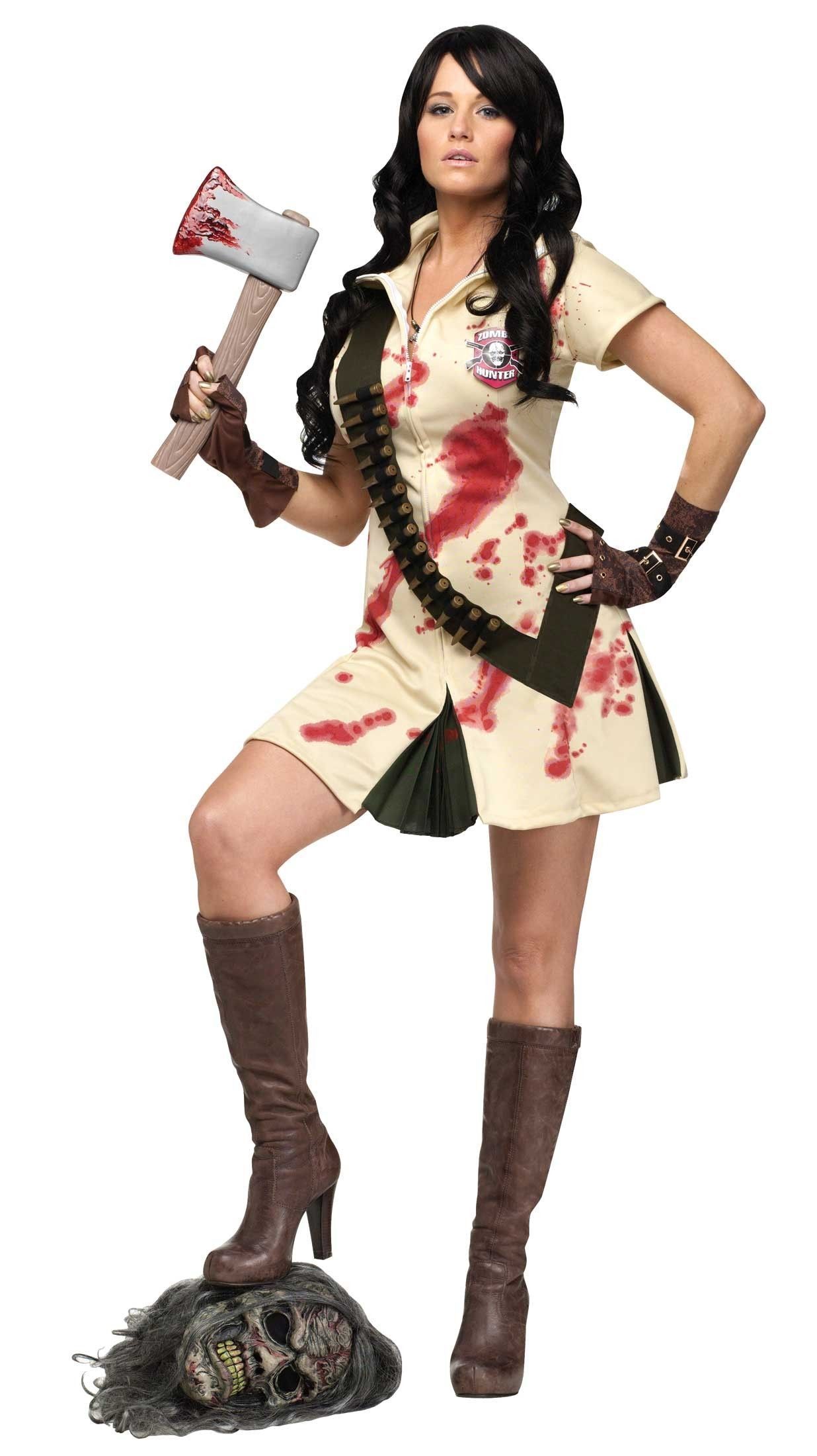 Костюм охотницы на зомби включает в себя короткое бежевое платьице на молнии с эмблемой на груди. Платье дополняют коричневые перчатки без пальцев, а также патронташ с пластиковыми патронами.