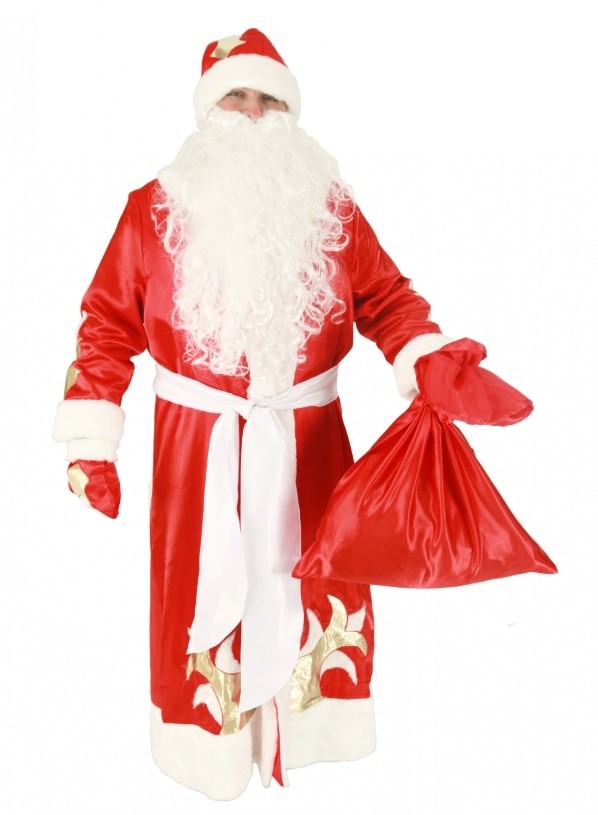 Роскошный костюм Деда Мороза - яркий красный костюм, который включает в себя шубу из атласного материала на подкладке, красную шапку с белым отворотом из меха, красные варежки, красный мешок, белый пояс, а также парик и густую белую бороду.