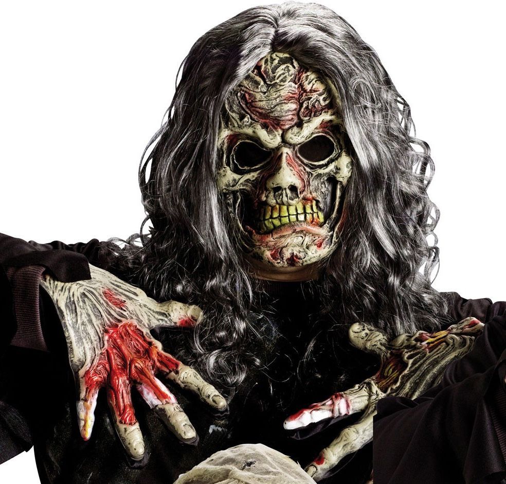 Маска и перчатки зомби с волосами выполнены из латекса. К маске прикреплены седые кучерявые волосы. На лице зомби красуется множество порезов, кровавых пятен, кривая злая улыбка с жёлтыми зубами и вырезы для глаз, выражающие злость. В вырезах для глаз имеется чёрная сетка. Перчатки с разорванной раной и множеством вен.