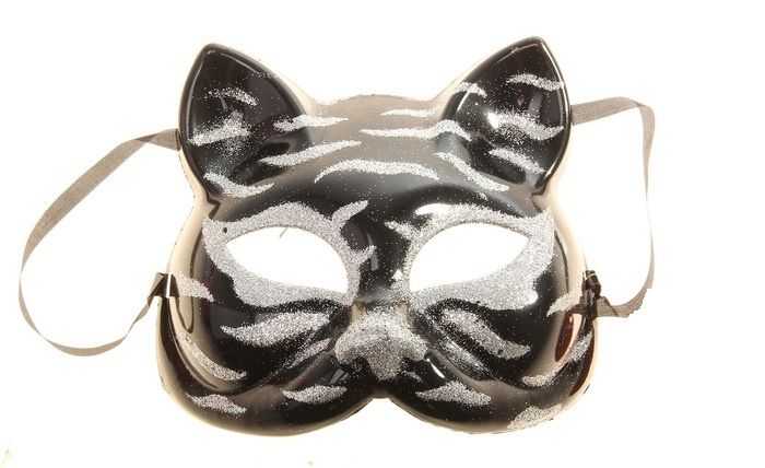 Черная маска кошечки с серебристыми полосами. Маска сделана из пластика, полностью скрывает лицо и имеет размер 16х17 см.