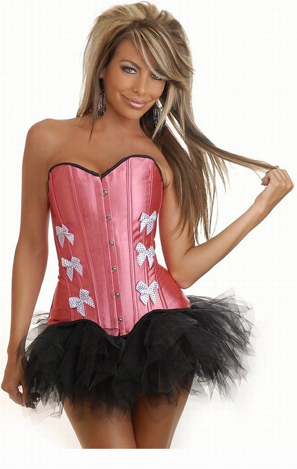 Розовый корсет с белыми бантами и юбкой на застежках спереди и шнуровке сзади. Юбка черного цвета. Белые бантики в черный горошек украшают корсет по бокам. В комплекте идут стринги.